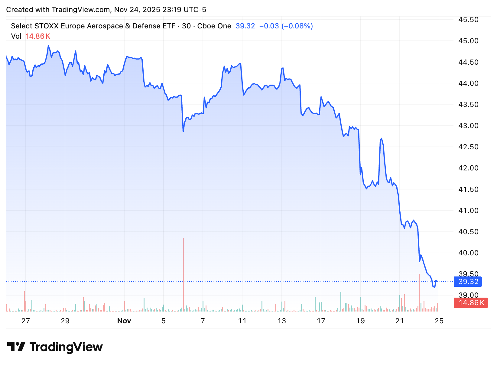 European markets reacted quickly to the rumors. The STOXX European Aerospace and Defense index (SXPARO), which tracks a basket of major defense stocks within the EU, began to slide on the 14th. The decline accelerated on the 19th with the appearance of rumors that the US proposal came with a “deadline” issued to Zelensky to sign a deal by the 28th. While the negotiations have now apparently devolved into a series of increasingly unrealistic European and Ukrainian counter-proposals, there’s been no reversal in this trend. The EUAD ETF, which closely tracks the index, has posted a 12% loss in the past month. This is a larger drop than the fund has experienced since the beginning of the war in Ukraine, and comes on the back of a 5% decline in the first half of October.
