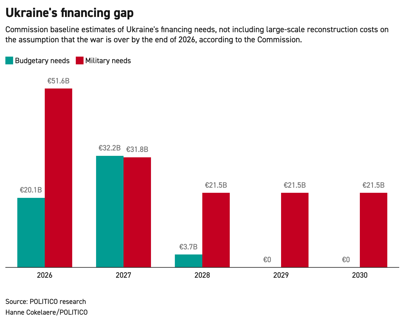 This chart, which was posted by Politico just two weeks ago based on EC numbers, assumes the war will end in 2026, only covers financing needs (what the Ukrainians can’t pay for themselves), and doesn’t include reconstruction costs, which the World Bank estimates will exceed €500 billion. If the Ukrainians have a €72 billion budgetary hole just for 2026, €45 billion certainly won’t cut it, even factoring in the few billion the IMF and Germany have pledged. As we’ve covered previously, even the €165 billion reparations loan wouldn’t have been enough to cover the Ukrainians for much longer than a year or two. Last month, the Economist calculated the Ukrainians would need a staggering $389 billion (€332B) in external financing over the next four years. The reality is that the Ukrainians need both massive loans from the EU and the Russian assets. Without the latter, they’ll have no choice but to make cuts. If we consider military costs, budgetary deficits, the cost of reconstruction, and Ukraine’s existing external debt, the country likely needs over a trillion euros of financial assistance over the next five to ten years.